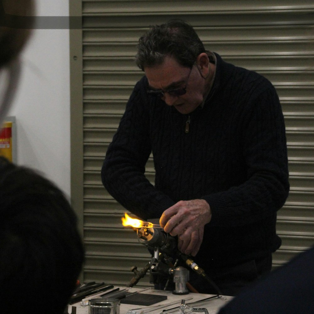 Mal started with a demonstration of scientific glass blowing showing how it can be used to build scientific equipment. Joining glass pieces together and bending glass tubes to create equipment.